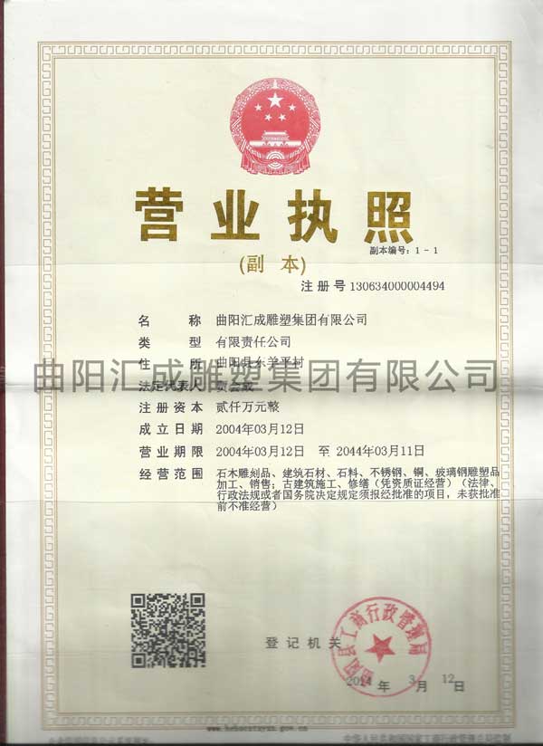 公司建于1986年坐落于中國雕刻之鄉(xiāng),河北省曲陽縣,占地80畝,雕刻大師、技師等員工300名,生產(chǎn)加工、園林、仿古、建筑、石木雕刻、銅雕、不銹鋼、玻璃鋼雕塑等,董事長賈會成,“城市雕塑創(chuàng)作設(shè)計師”;中國“石雕藝術(shù)大師”;省工藝美術(shù)師;中國國家人才網(wǎng)國際注冊工藝美術(shù)師;河北省雕塑行業(yè)協(xié)會副會長,河北省工藝美術(shù)協(xié)會副秘書長,現(xiàn)代教育理論與實踐論壇評委會專家委員,中國民主促進會會員,并多次赴國外進行學(xué)術(shù)交流,第十屆河北省人大代表。